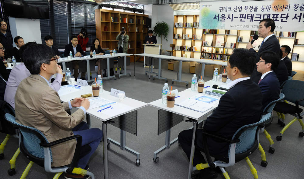 박원순 시장이 18일 오전 서울 강남구 역삼동 팁스타운에서 열린 서울시-핀테크 대표단 서밋에서 인사말을 하고 있다. 서울시 제공