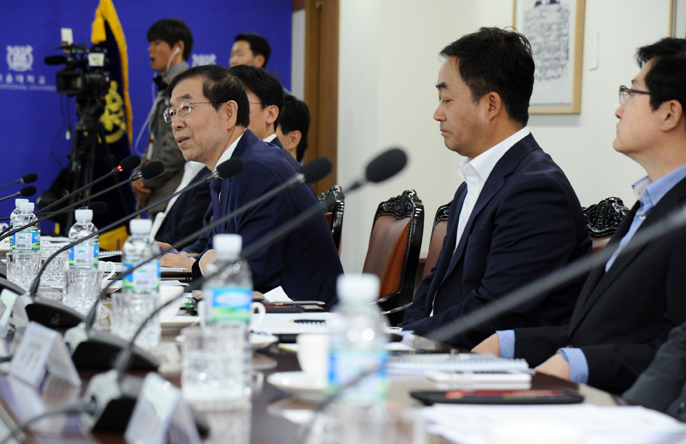 박원순 서울시장과 성낙인 서울대학교 총장이 26일 낮 서울 관악구 서울대학교 대학본부 대회의실에서 열린 서울시-서울대학교 총장 서밋에서 청년 일자리 창출ㆍ지역 활성화 등을 위한 공동협력 MOU를 체결하고 있다. 서울시 제공