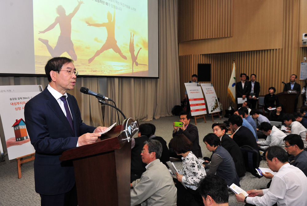 26일 서울시청에서 열린 역세권 2030청년주택 설명회에서 박원순 서울시장이 사업계획에 대해 설명하고 있다. 서울시 제공