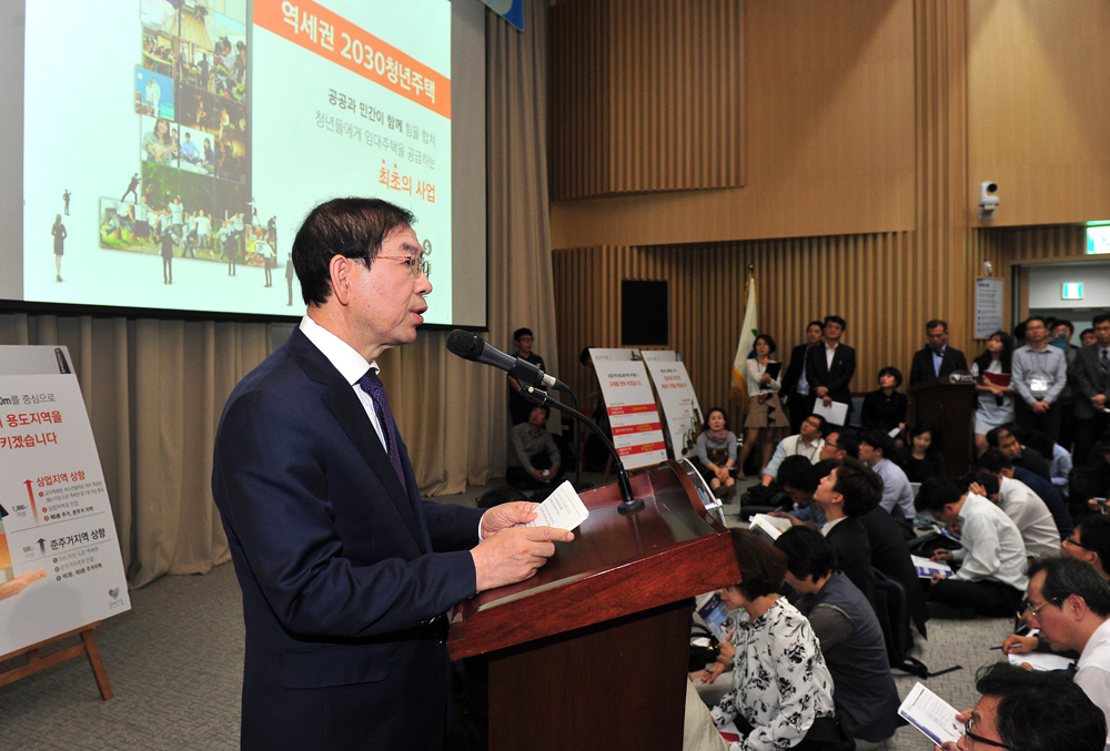 26일 서울시청에서 열린 역세권 2030청년주택 설명회에서 박원순 서울시장이 사업계획에 대해 설명하고 있다. 서울시 제공