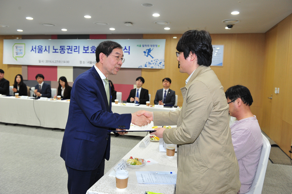 박원순 서울시장이 27일 서울시청에서 노동권리보호관에 위촉된 변호사, 노무사 등과 기념촬영을 하고 있다. 서울시 제공