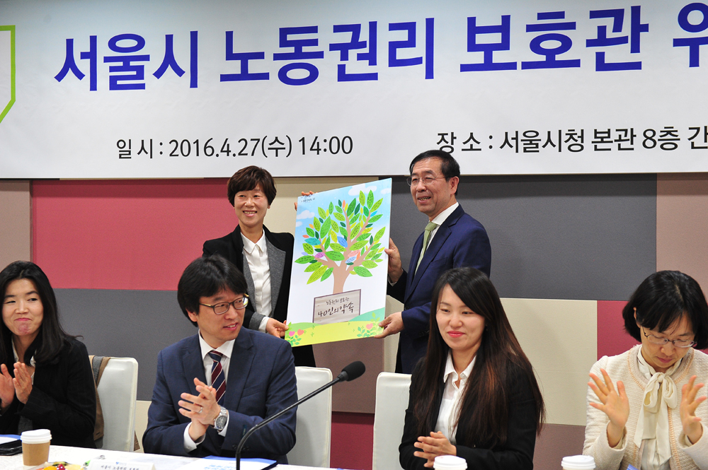 박원순 서울시장이 27일 서울시청에서 노동권리보호관에 위촉된 변호사, 노무사 등과 기념촬영을 하고 있다. 서울시 제공