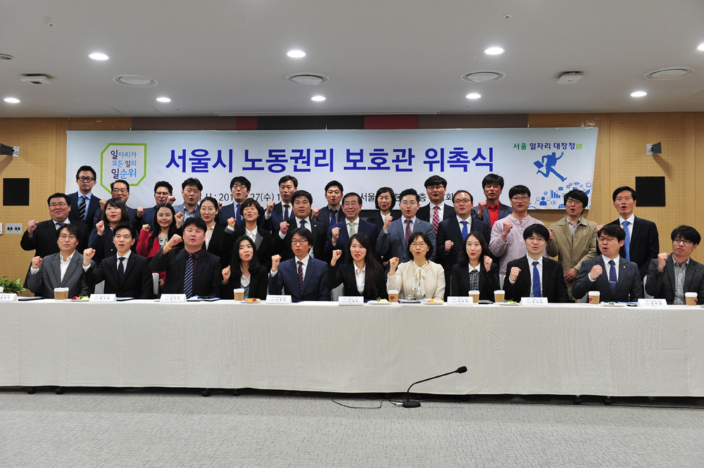 박원순 서울시장이 27일 서울시청에서 노동권리보호관에 위촉된 변호사, 노무사 등과 기념촬영을 하고 있다. 서울시 제공