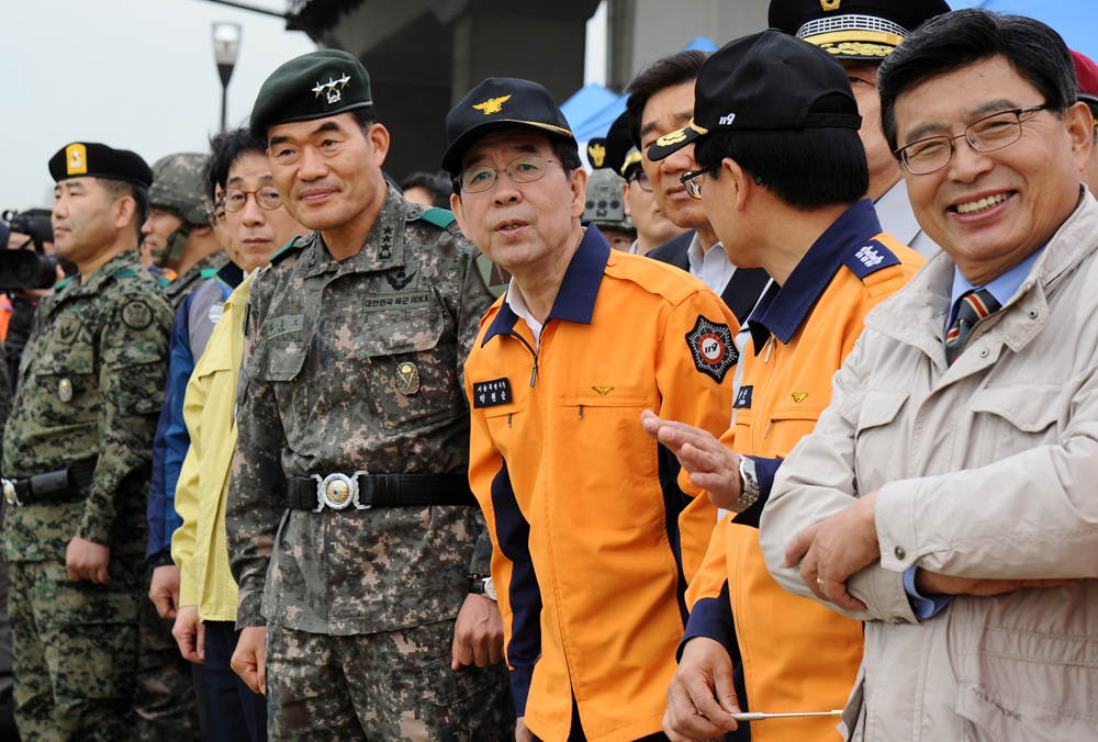 27일 오후 서울 여의도 한강공원과 원효대교 남단 일대에서 열린 '재난으로부터 안전한 서울 구현'을 위한 대규모 복합재난 상황 가상 민·관·군 합동훈련에 박원순 시장이 참석하고 있다. 서울시 제공