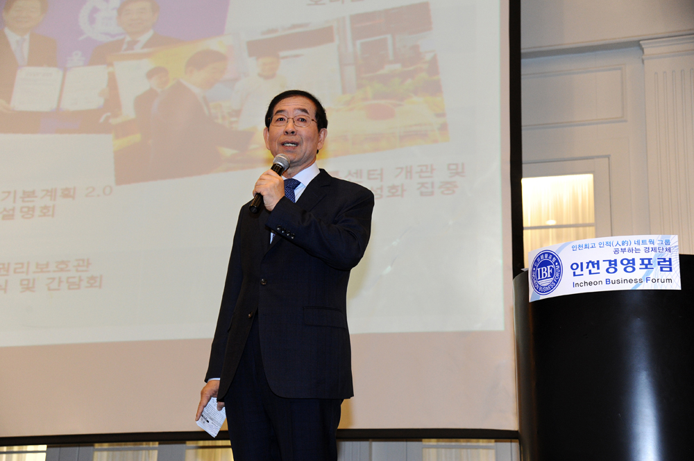 박원순 서울시장이 28일 오전 인천시 연수구 송도 라마다호텔 다빈치 홀에서 열린 인천경영포럼 제341회 조찬강연회에서 '협치와 혁신으로 피어라 서울!'이라는 주제로 강연하고 있다. 서울시 제공