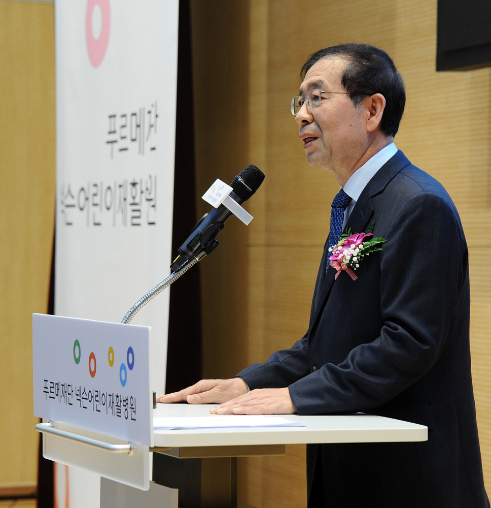 28일 오전 서울 마포구 상암동 푸르메재단 넥슨어린이재활병원에서 열린 개원식에서 박원순 서울시장이 축사를 하고 있다. 서울시 제공