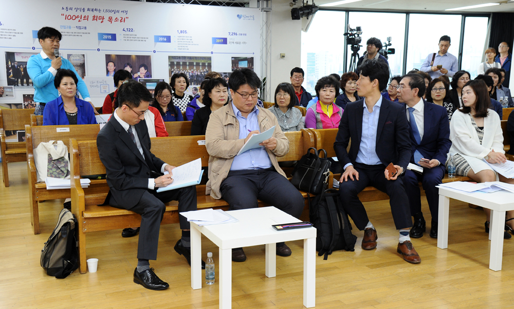 박원순 서울시장이 2일 오후 성동구 서울시설관리공단에서 열린 비정규직의 정규직화 정책 4주년 간담회에 참석해 근로자들의 의견을 경청하고 있다. 서울시 제공