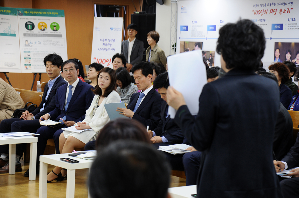 박원순 서울시장이 2일 오후 성동구 서울시설관리공단에서 열린 비정규직의 정규직화 정책 4주년 간담회에 참석해 근로자들의 의견을 경청하고 있다. 서울시 제공