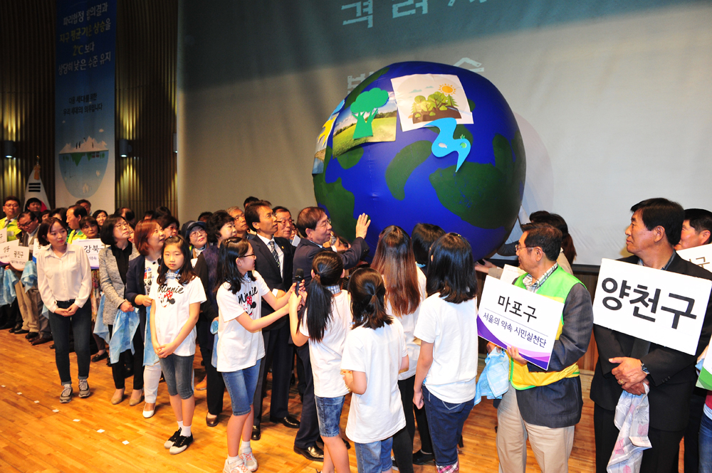 2일 오전 서울 중구 서울시청 다목적홀에서 열린 'C0₂1인 1톤 줄이기를 위한 서울의 약속 시민실천단협의회 발대식'에서 박원순 서울시장이 격려사를 하고 있다. 서울시 제공