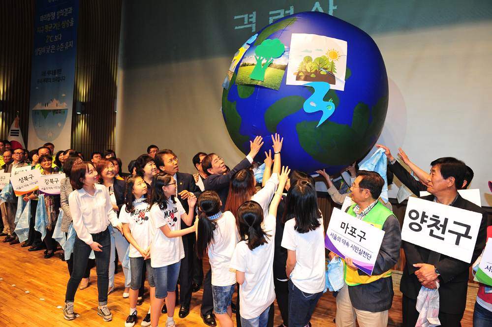 2일 오전 서울 중구 서울시청 다목적홀에서 열린 'C0₂1인 1톤 줄이기를 위한 서울의 약속 시민실천단협의회 발대식'에서 박원순 서울시장이 격려사를 하고 있다. 서울시 제공