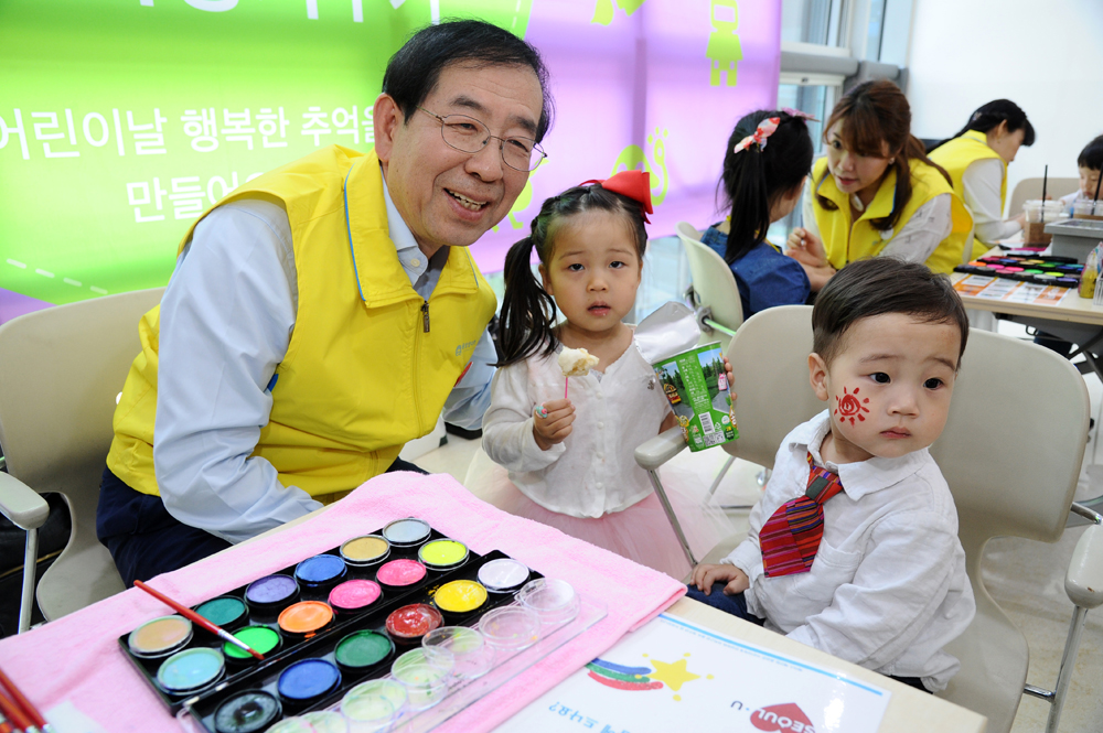 박원순 서울시장이 5일 오후 어린이날을 맞아 서울 광진구 능동 어린이대공원을 찾아 어린이와 놀이를 하고 있다. 박원순 서울시장은 어린이대공원 내 서울상상나라에서 아이들에게 직접 페이스 페인팅을 해주고 피에로로 변신해 다양한 모양의 풍선을 선물하는 등 아이들에게 특별한 즐거움을 선사했다. 서울시 제공 |