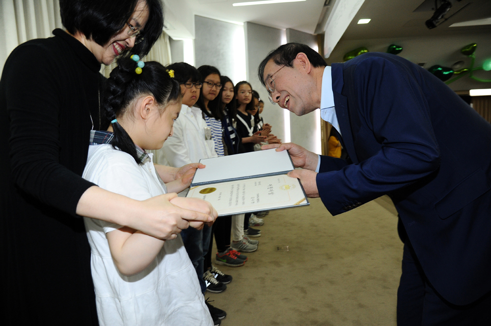 어린이날인 5일 오전 서울 중구 서울시청 서소문별관에서 열린 '제94회 어린이날 기념행사, 2016년 서울특별시 어린이 및 청소년상 시상식'에서 박원순 서울시장이 참석 어린이에게 시상을 하고 있다. 서울시는 5월 청소년의 달을 기념해 타의 모범이 되는 어린이 및 청소년과 청소년 보호, 육성에 공헌한 청소년 지도자 및 단체에 대해 '서울특별시 어린이 및 청소년상'을 수여하고 있다. 서울시 제공 |