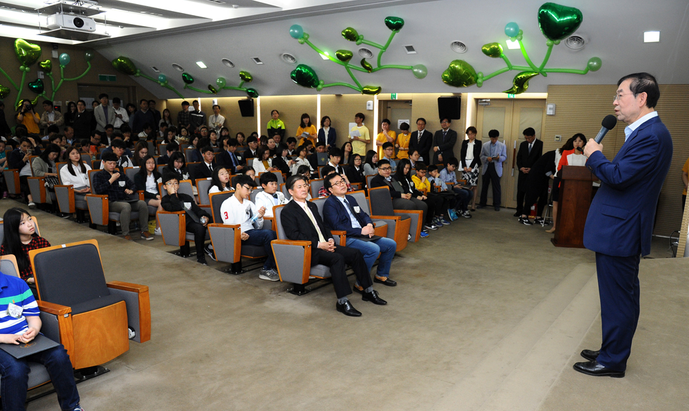 어린이날인 5일 오전 서울 중구 서울시청 서소문별관에서 열린 '제94회 어린이날 기념행사, 2016년 서울특별시 어린이 및 청소년상 시상식'에서 박원순 서울시장이 참석 어린이에게 시상을 하고 있다. 서울시는 5월 청소년의 달을 기념해 타의 모범이 되는 어린이 및 청소년과 청소년 보호, 육성에 공헌한 청소년 지도자 및 단체에 대해 '서울특별시 어린이 및 청소년상'을 수여하고 있다. 서울시 제공 |