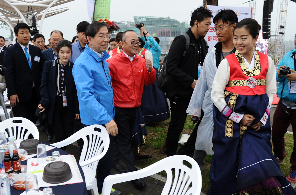 박원순 서울시장과 중국 중마이 그룹 리다빙 총재가 6일 서울 반포한강공원에서 열린 삼계탕 파티에서 식사하고 있다. 서울시 제공