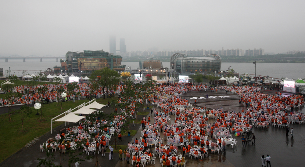 박원순 서울시장과 중국 중마이 그룹 리다빙 총재가 6일 서울 반포한강공원에서 열린 삼계탕 파티에서 식사하고 있다. 서울시 제공