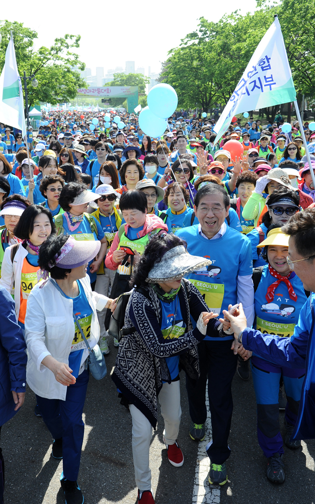박원순 서울시장이 7일 오전 서울 마포구 상암동 원드컵공원 평화의광장에서 열린 제16회 여성마라톤대회에서 힘찬 출발을 하고 있다. 서울시 제공