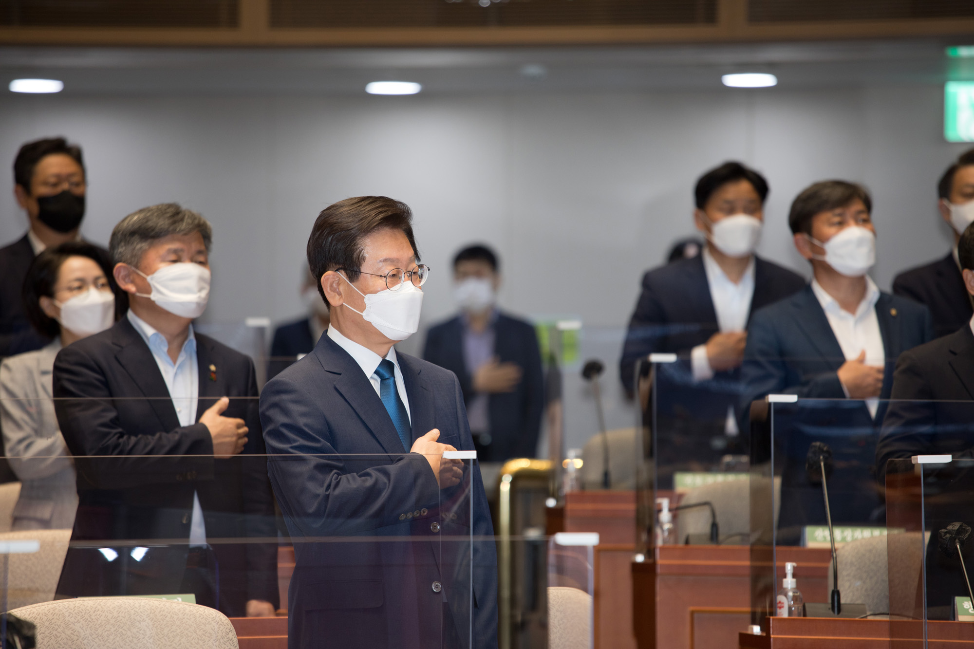22일 오전 예결위장에서 열린 더불어민주당 의원총회에 참석한 이재명 의원이 국민의례를 하고 있다.