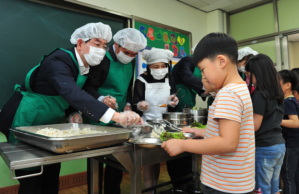 11일 오전 서울 영등포구 서울신영초등학교에서 열린 '서울시 학교 장독대 1호 열음식'에서 박원순 서울시장과 참석자들이 장 담그기 체험을 하고 있다. 서울시 제공
