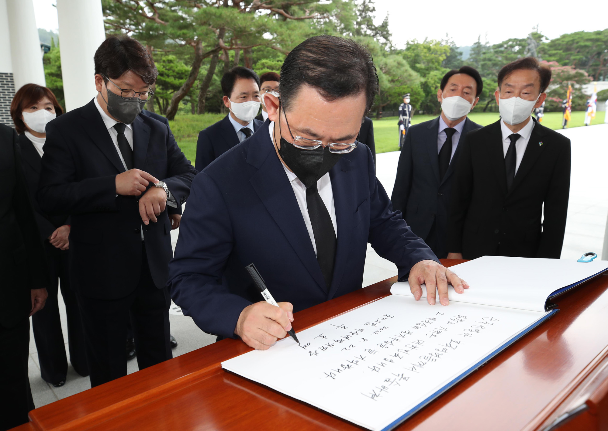 주호영 국민의힘 비상대책위원장이 22일 오전 서울 동작구 국립서울현충원에서 참배한 후 방명록을 작성하고 있다.
