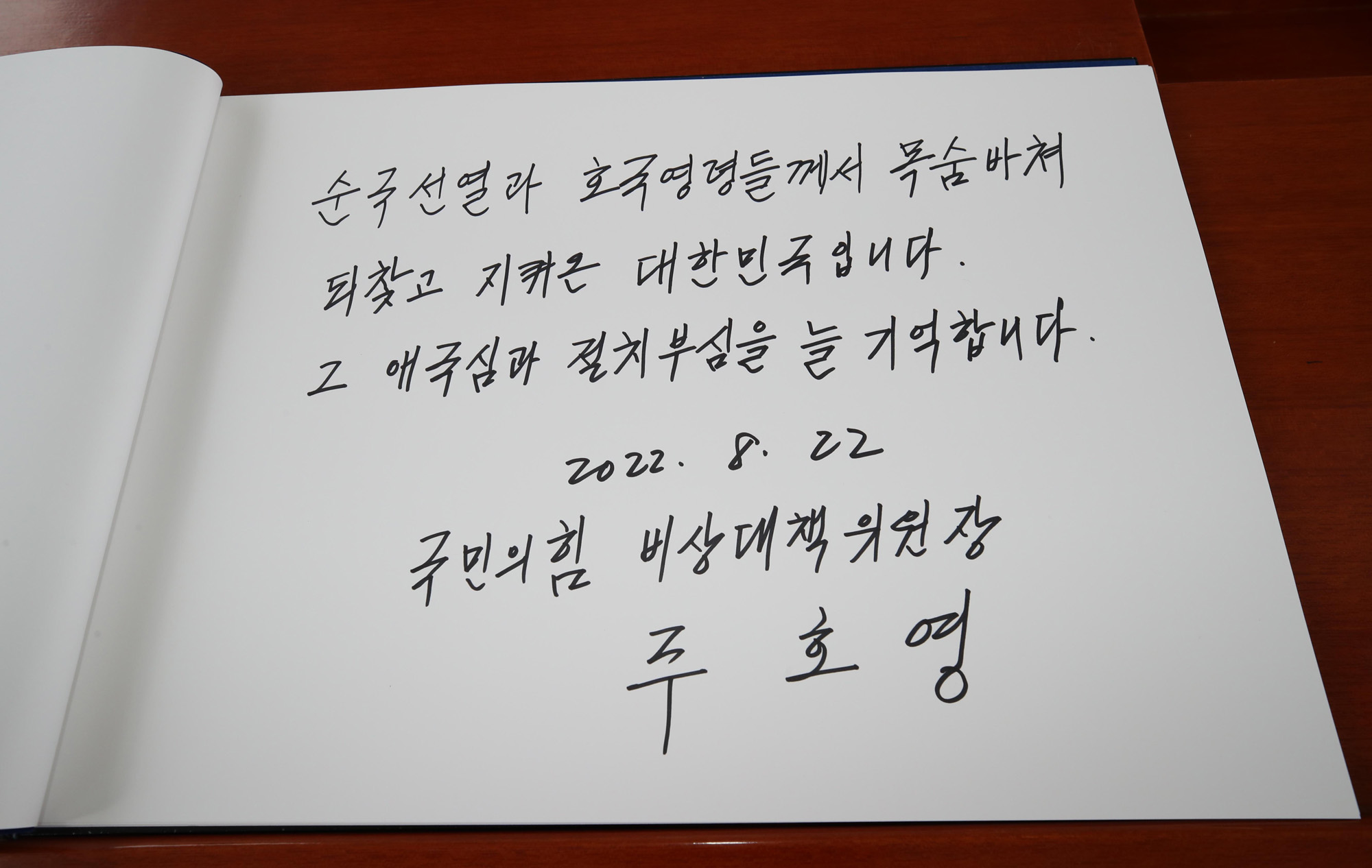 주호영 국민의힘 비상대책위원장과 권성동 원내대표 등이 22일 오전 서울 동작구 국립서울현충원에서 참배했다. 주호영 비대위원장이 ‘순국선열과 호국영령들께서 목숨바쳐 되찾고 지켜온 대한민국입니다. 그 애국심과 절치부심을 늘 기억합니다’ 라고 방명록을 작성했다.