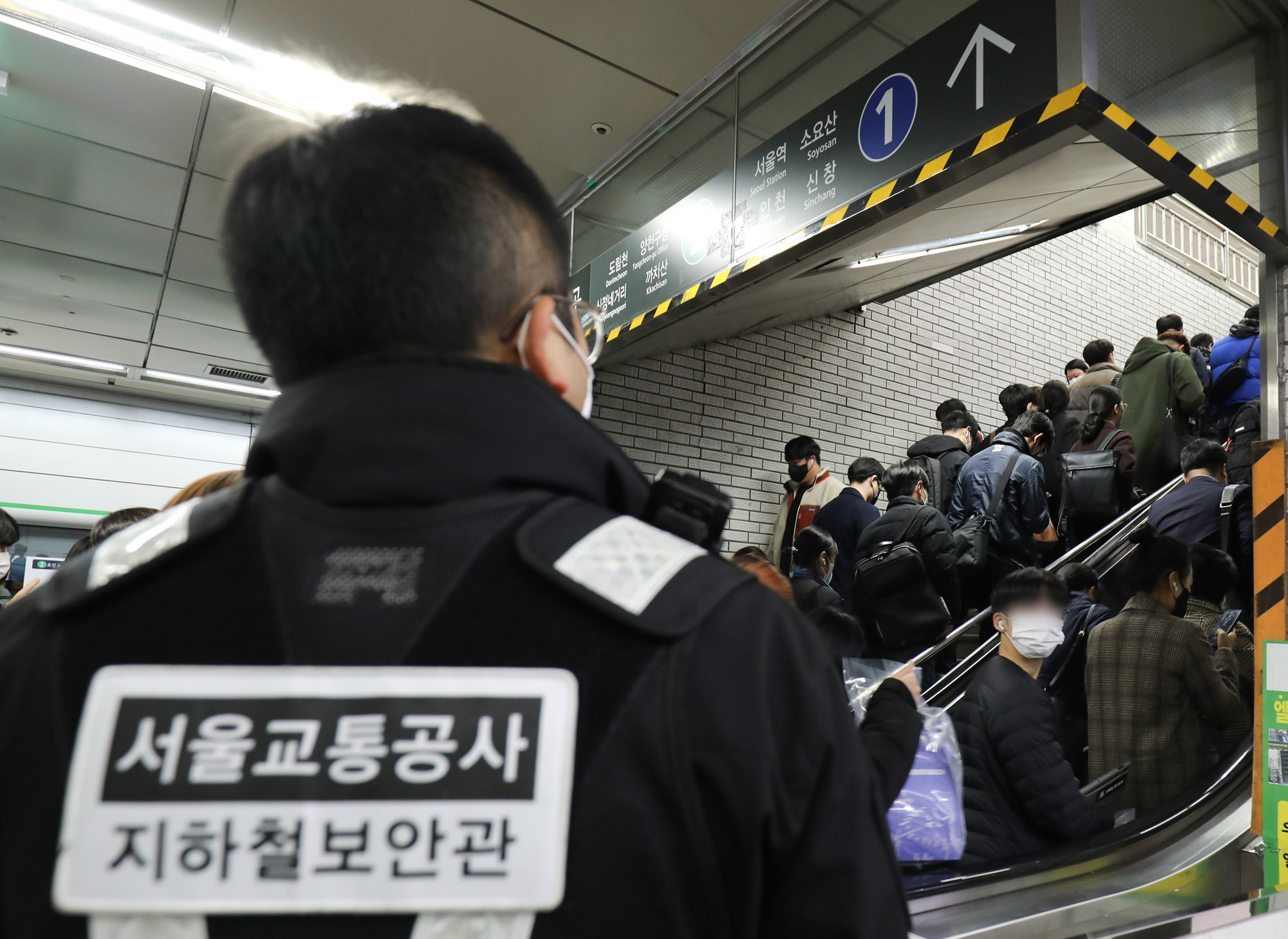 [서울=eoimage] 박정훈 기자 = 한덕수 국무총리가 이태원 핼러윈 참사재발 방지를 위한 후속 대책으로 출·퇴근 시간 등 지하철 혼잡시간대에 질서유지 안전활동을 실시하기로 발표한 4일 오후 서울 구로구 신도림역에서 서울교통공사 관계자들이 시민의 안전을 위해 질서유지를 하고 있다. 2022.11.4.eomaster@eoimage.com |