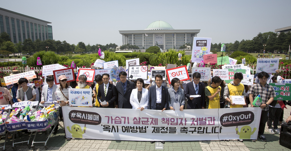 시민단체들이 31일 국회 본관 앞에서 옥시 반대 기자회견을 열였다. 이 자리에서 시민단체 회원들은 플래카드를 펼치고 옥시 제품이 담긴 쇼핑카트를 정렬한 채 향후 행보에 대해 밝혔다. 이날 기자회견은 야당 소속 국회의원들도 함께 해 문제기업의 '징벌적 손해배상제' 추진을 약속했다. 2015.05.31 사진 임준선기자 |