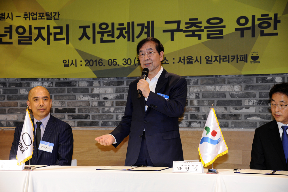 박원순 서울시장이 30일 마포구 홍대입구역 2번출구 인근에 조성한 '서울시 1호 일자리카페' 개소식에 참석해 시설을 둘러보고 있다. 서울시 제공
