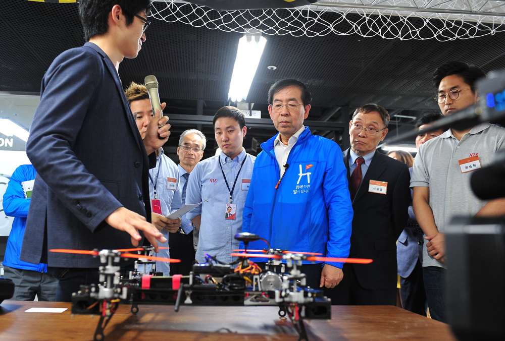 박원순 서울시장이 31일 오후 서울 용산전자상가에서 열린 '디지털대장간' 개소식에서 관계자들에게 시제품제작소에 대한 설명을 듣고 있다. 서울시 제공