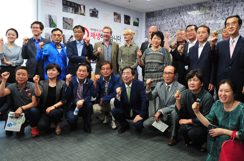 2일 서울 중구 만리동 스카이1004빌딩에서 열린 도시재생지원센터 개소식에 참석한 박원순 서울시장(맨 왼쪽)이 참석자와 이야기하고 있다. 서울시 제공