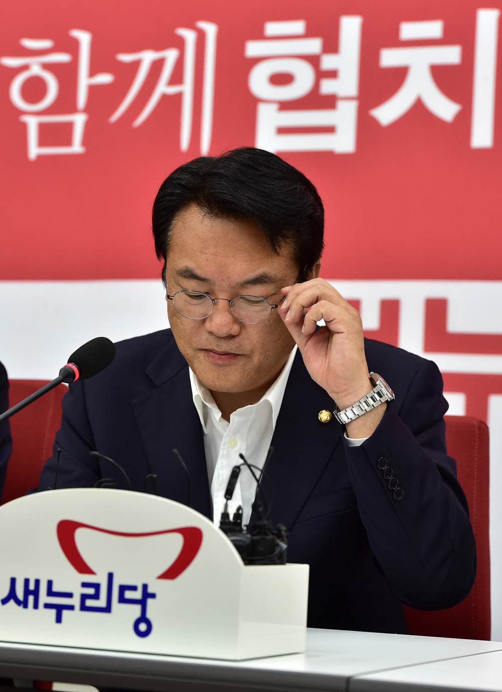 정진석 새누리당 원내대표가 8일 국회에서 열린 원내대책회의에서 안경을 고쳐쓰고 있다. 2016.06.08