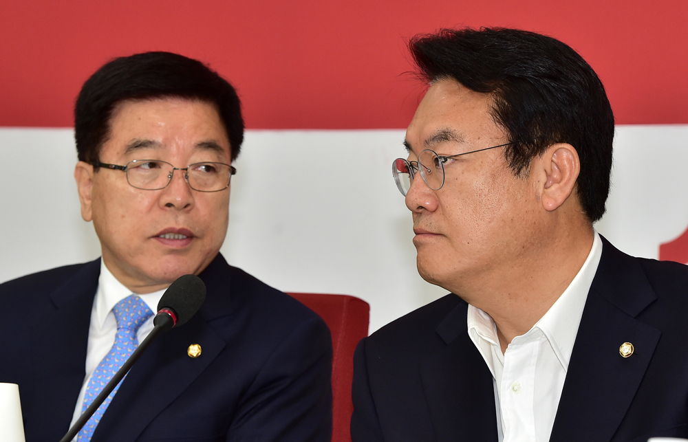 정진석 새누리당 원내대표와 김광림 정책위의장이 8일 국회에서 열린 원내대표단회의에서 대화를 나누고 있다.2016.06.08