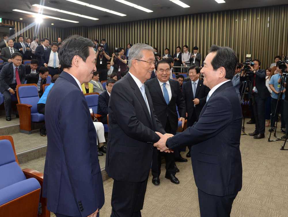 더불어민주당 정세균 의원이 9일 국회에서 열린 의원총회에서 국회의장 후보에 선출된 뒤 김종인 비대위 대표, 우상호 원내대표와 인사하고 있다.