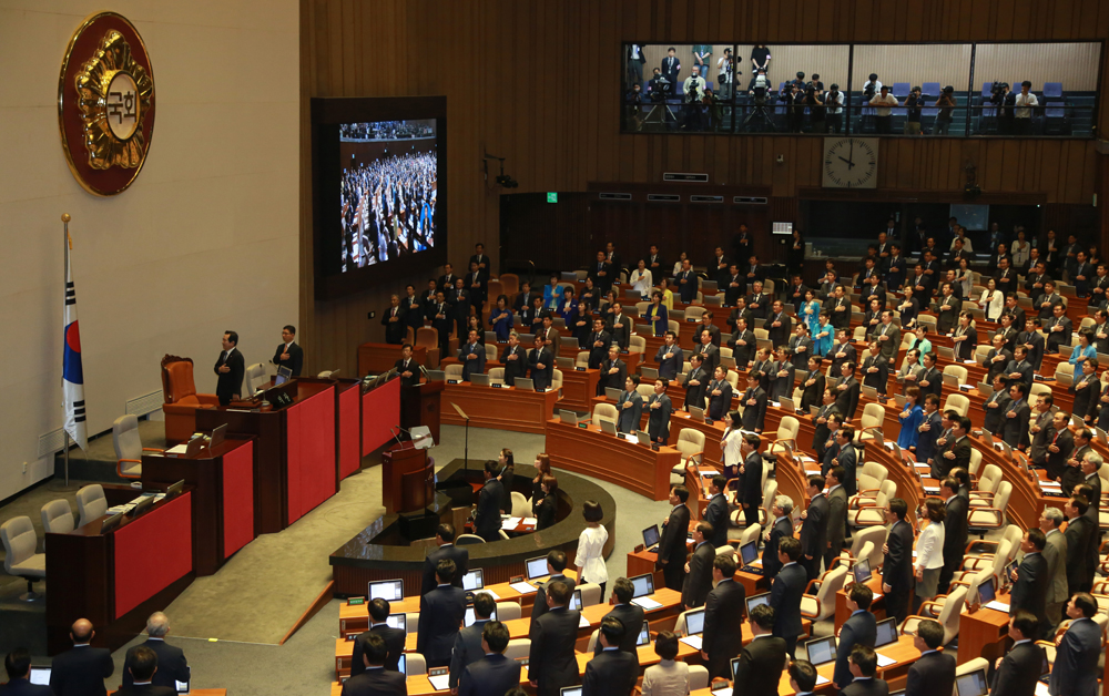 13일 오전 서울 여의도 국회에서 열린 20대 국회 개원식에 참석한 의원들이 국민의례를 하고 있다.