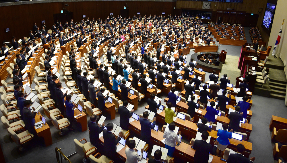 아시아투데이 이병화 기자 = 정세균 국회의장을 비롯한 20대 국회의원들이 13일 오전 국회 본회의장에서 열린 '제20대 국회 개원식'에서 선서를 하고 있다. /이병화 기자photolbh@