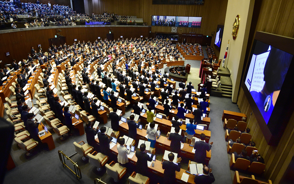 아시아투데이 이병화 기자 = 정세균 국회의장을 비롯한 20대 국회의원들이 13일 오전 국회 본회의장에서 열린 '제20대 국회 개원식'에서 선서를 하고 있다. /이병화 기자photolbh@