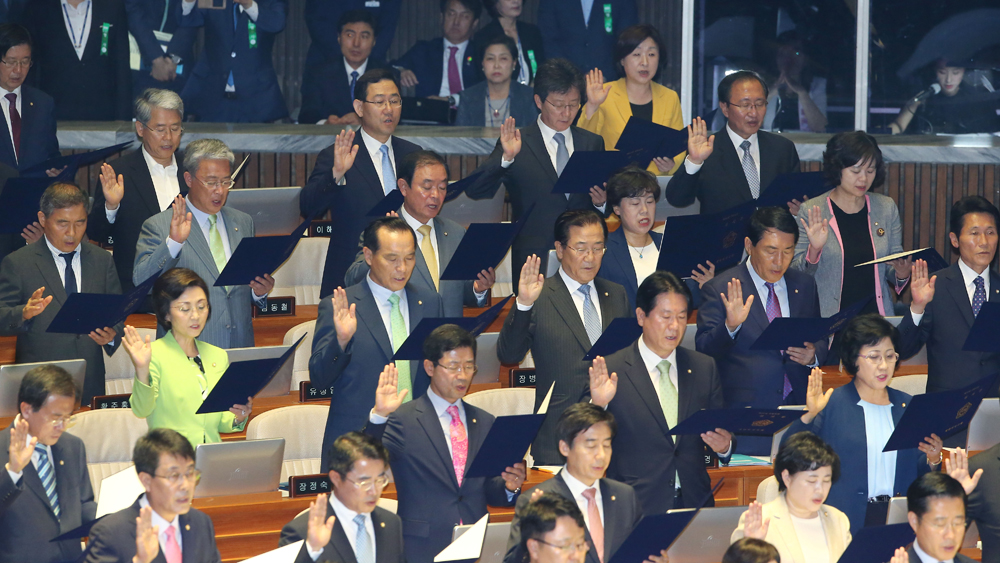 13일 오전 서울 여의도 국회에서 열린 제20대 국회 개원식에서 20대 국회의원들이 선서를 하고 있다.