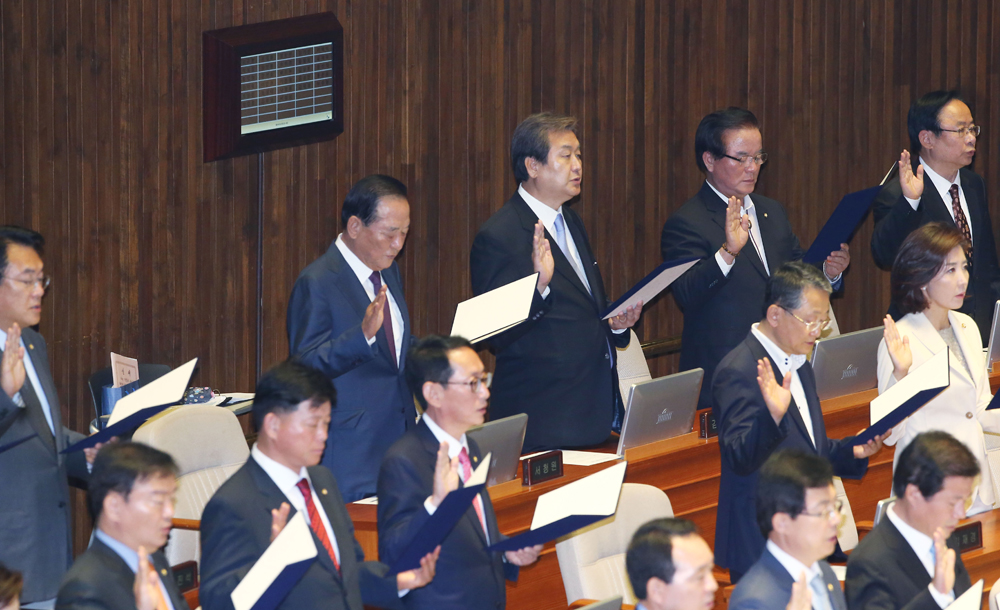 김무성 새누리당 전 대표 등 의원들이 13일 오전 서울 여의도 국회에서 열린 제20대 국회 개원식에서 국회의원 선서를 하고 있다.