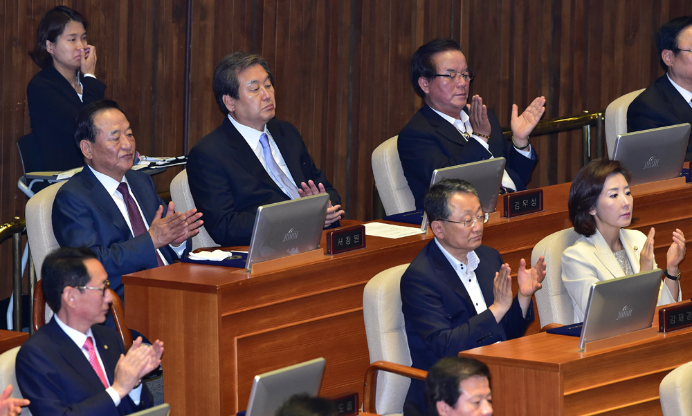 아시아투데이 이병화 기자 = 김무성-서청원 새누리당 의원 등이 13일 오전 국회 본회의장에서 열린 '제20대 국회 개원식'에서 박근혜 대통령의 개원연설을 경청하며 박수를 치고 있다. /이병화 기자photolbh@