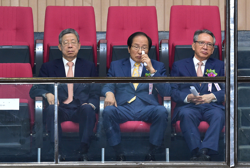 아시아투데이 이병화 기자 = 김희옥 새누리당 혁신비대위원장(왼쪽부터)과 신경식 헌정회 회장, 김형오 전 국회의장이 13일 오전 국회 본회의장에서 열린 '제20대 국회 개원식'에서 박근혜 대통령의 개원연설을 경청하고 있다. /이병화 기자photolbh@
