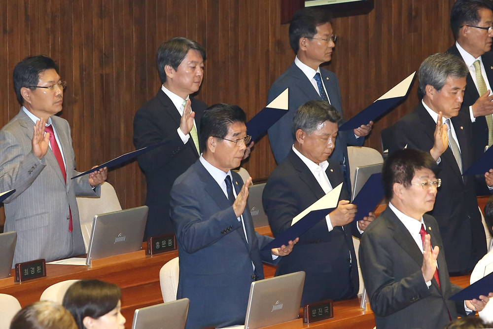 안철수 국민의당 공동대표가 20대 국회 개원일인 13일 오전 국회 본회의장에서 열린 개원식에서 의원선서를 하고 있다.