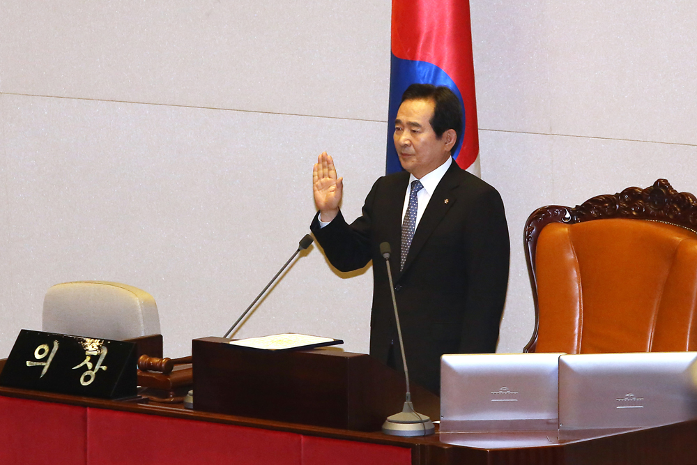 정세균 국회의장이 20대 국회 개원일인 13일 오전 국회 본회의장에서 열린 국회 개원식에서 의원선서를 하고 있다.