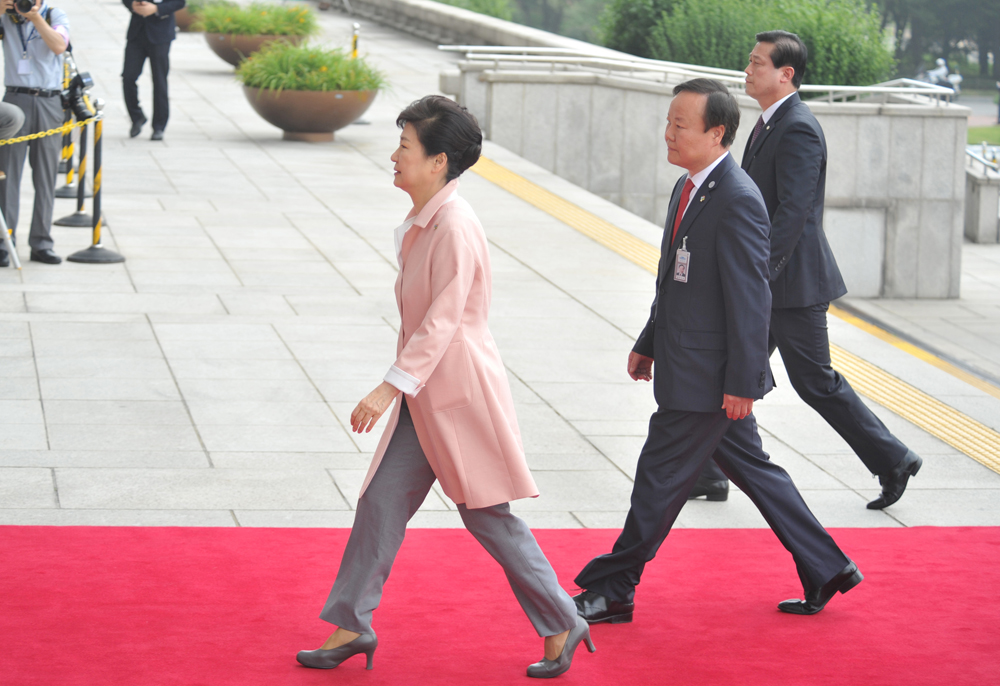 박근혜 대통령이 13일 오전 서울 여의도 국회 본회의장에서 열린 20대 국회 개원식에 참석하기 위해 김재원 정무수석과 함께 입장히고 있다. /6.13 /뉴데일리 이종현 기자
