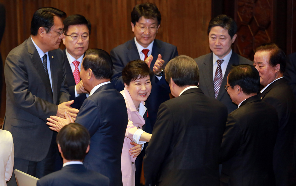 박근혜 대통령이 13일 오전 서울 여의도 국회에서 열린 제20대 국회 개원식에 참석해 개원 연설을 마친 뒤 김무성 의원과 악수를 나누고 있다.