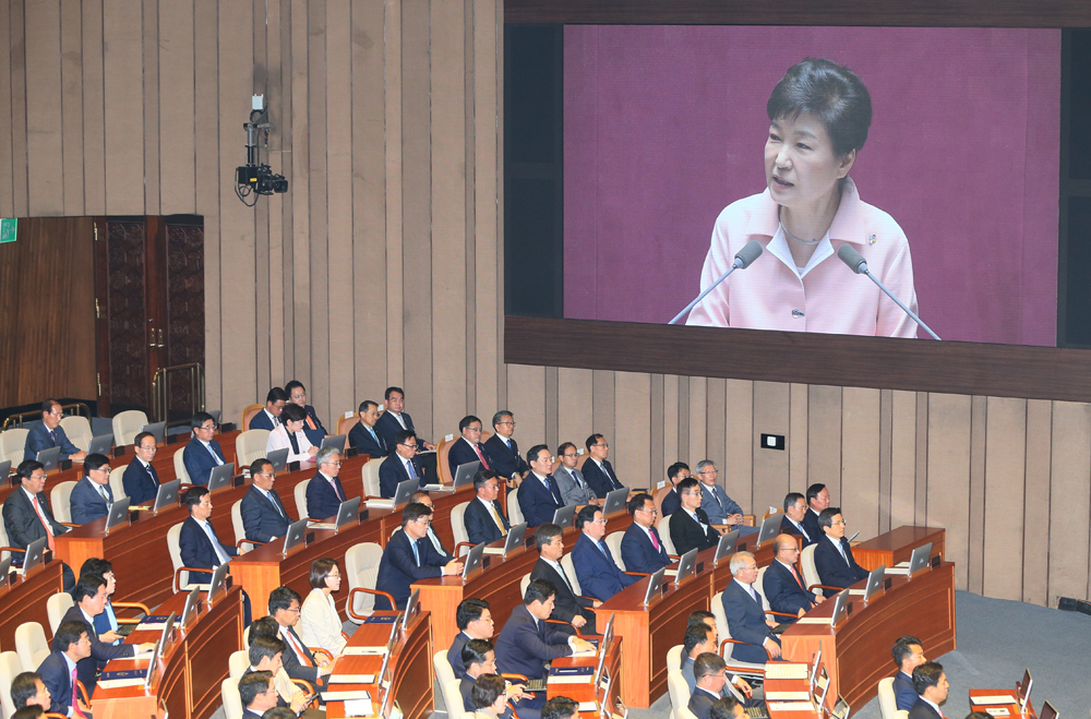 13일 서울 여의도 국회 본회의장에서 열린 제20대 국회 개원식에서 더불어민주당 의원들이 황교안 총리를 비롯한 국무위원들이 박근혜 대통령의 연설을 듣고 있다. 2016.6.13/뉴스1