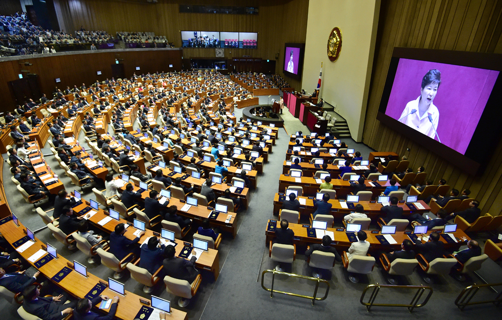 아시아투데이 이병화 기자 = 박근혜 대통령이 13일 오전 국회 본회의장에서 열린 '제20대 국회 개원식'에서 개원연설을 하고 있다. /이병화 기자photolbh@