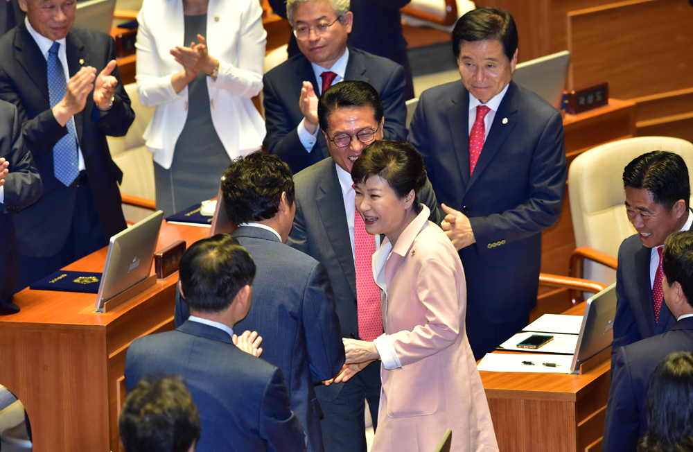 아시아투데이 이병화 기자 = 박근혜 대통령이 13일 오전 국회 본회의장에서 열린 '제20대 국회 개원식'에서 개원연설을 마친 뒤 의원들과 인사를 나누며 퇴장하고 있다. /이병화 기자photolbh@
