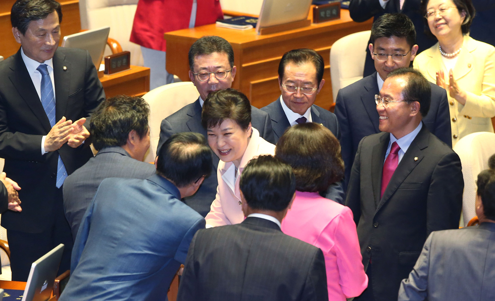 박근혜 대통령이 13일 오전 서울 여의도 국회에서 열린 제20대 국회 개원식에서 연설을 마친 뒤 새누리당 의원들과 인사를 하며 본회의장을 나가고 있다.