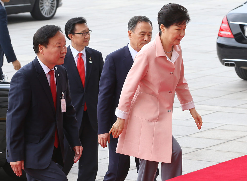 박근혜 대통령이 20대 국회 개원식이 열리는 13일 오전 개원 연설을 하기 위해 여의도 국회에 도착해 김재원 정무수석의 응접을 받으며 본청에 들어서고 있다. 2016.06.13 뉴스웨이 이수길