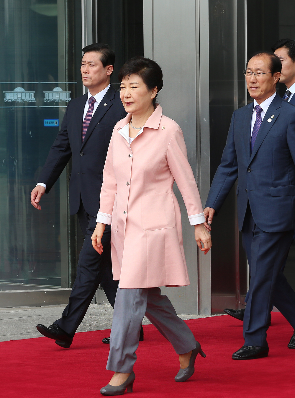 박근혜 대통령이 20대 국회 개원식이 열린 13일 오전 서울 여의도 국회에서 개원 연설을 마치고 박형준 국회 사무총장의 배웅을 받으며 본청에서 나서고 있다. 2016.06.13 뉴스웨이 이수길