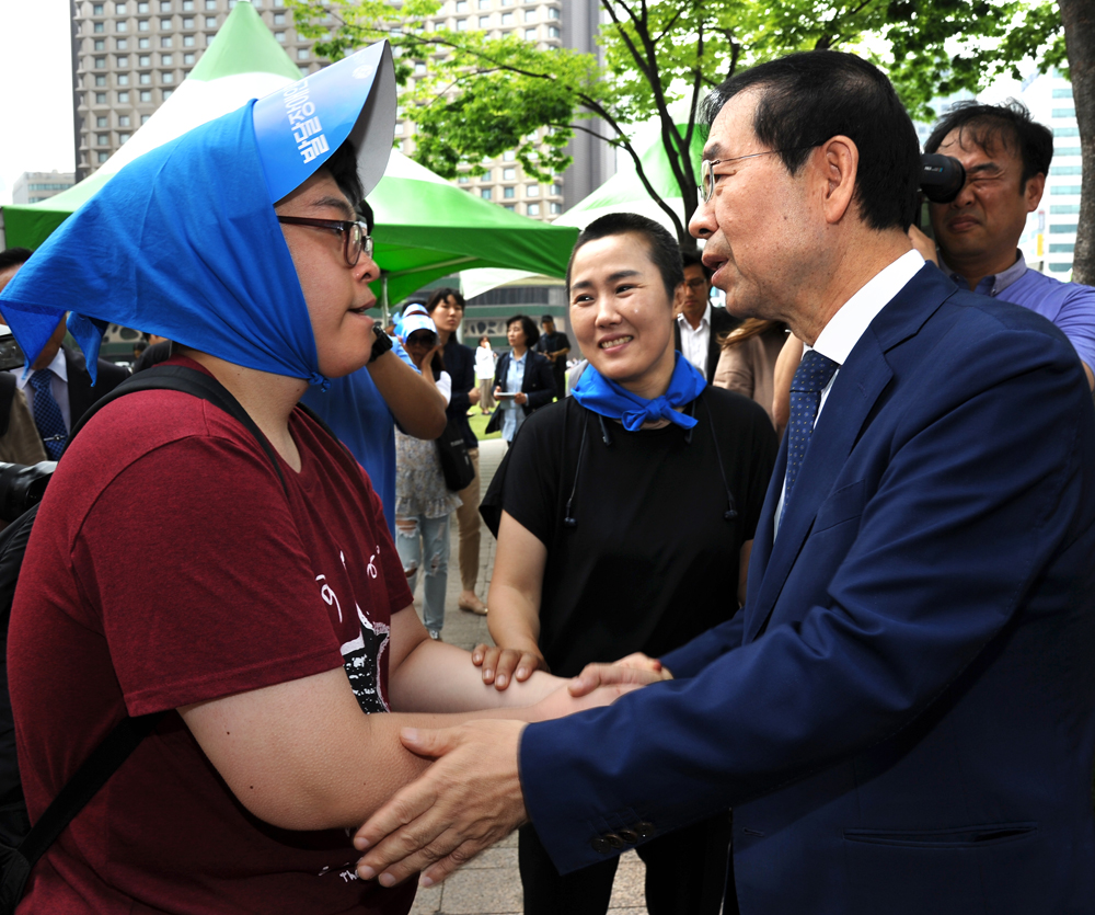 박원순 서울 시장(왼쪽)이 14일 오후 서울 중구 서울시청 앞에서 열린 발달장애인 부모들의 '서울시청 농성 철회' 기자회견장을 찾아 부모들을 위로하고 있다. 서울시 제공